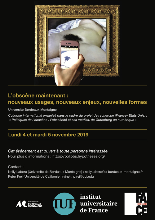 Ce colloque est la deuxième conférence internationale organisée dans le cadre du projet de recherche franco-américain « Politiques de l’obscène : l’obscénité et ses médias, de Gutenberg au numérique » soutenu par le Thomas Jefferson Fund de la FACE Foundation après une première rencontre qui s’est tenue à l’Université de Californie à Irvine en février 2019 (« Politics of the Obscene : Obscenity and its Mediations in Early Modern Europe »).