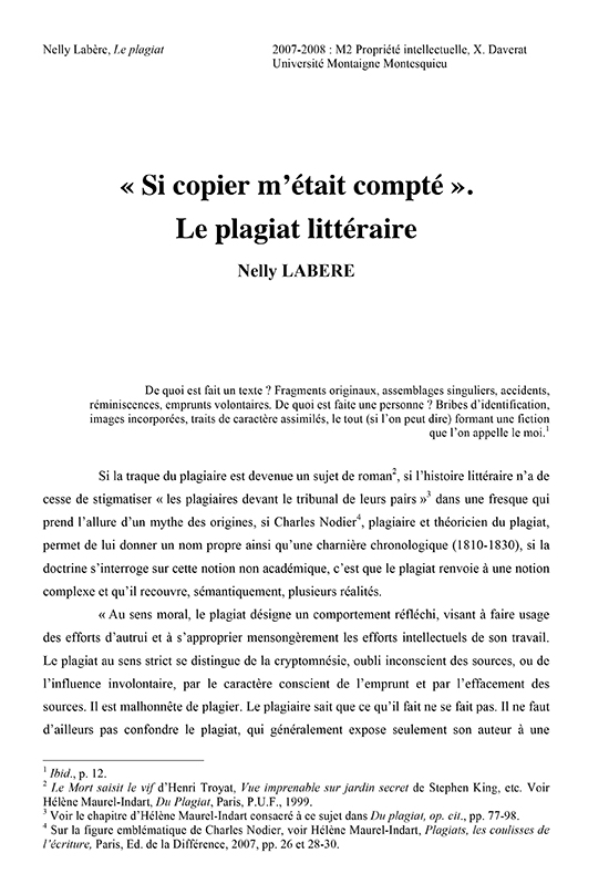 « Si copier m’était compté ». Le plagiat littéraire.Mémoire de M2 professionnel, Droit de la Propriété Intellectuelle, Université Bordeaux Montesquieu.